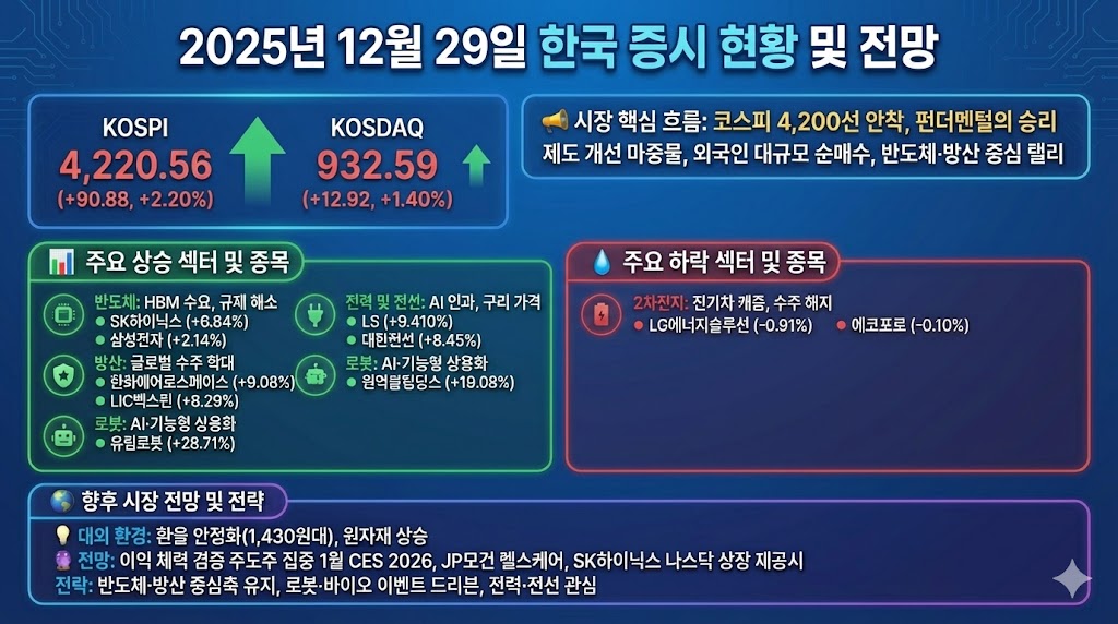 결론적으로, 오늘 시장은 제도적 규제 완화와 업황에 대한 자신감이 결합되어 빚어낸 기록적 상승이었습니다. 코스피 4,200선 안착은 향후 추가 랠리를 위한 견고한 발판이 될 것입니다. 향후 시장 전략으로는 실적 성장의 가시성이 확보된 반도체와 방산 섹터를 포트폴리오의 견고한 중심축으로 유지하면서, 1월 초 예정된 글로벌 행사 모멘텀을 활용해 기술 경쟁력이 입증된 로봇 및 바이오 종목에 선제적으로 접근하는 이벤트 드리븐 전략을 병행하는 것이 효율적입니다. 아울러 구리 가격 상승을 실질적인 이익으로 전환할 수 있는 전력 및 전선 업종에 대해서도 긍정적인 시각을 견지하며 인프라 투자 확대 수혜를 온전히 누리는 압축적인 대응이 필요한 시점입니다.