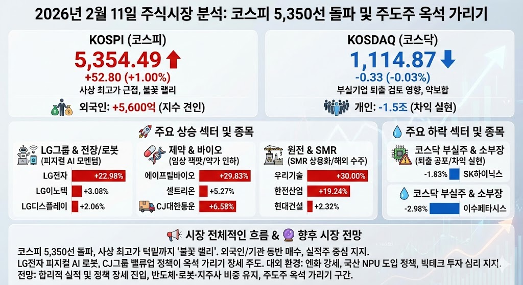 2026년 2월 11일 주식시장은 설 연휴를 앞둔 관망세 속에서도 '실적'과 '주주환원'이라는 확실한 명분을 가진 종목들이 폭발하며 코스피 5,350선을 돌파, 사상 최고가에 근접하는 강력한 저력을 보여주었습니다. 특히 LG전자의 피지컬 AI 로봇 모멘텀과 CJ그룹의 파격적인 밸류업 정책이 시장의 온기를 중소형주로 확산시키며 '옥석 가리기' 장세의 정점을 찍었습니다.
